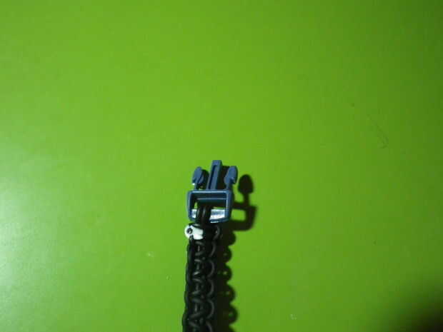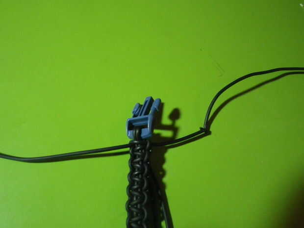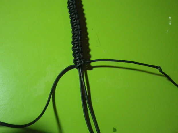 Mantener nudos hasta que es casi la longitud correcta. Poner los cordones más corto y media por el otro lado de la hebilla. Doble los cables hacia atrás y haga nudos sobre ellos. Cuando la pulsera tiene la longitud correcta, corte y pegue los extremos.
