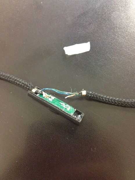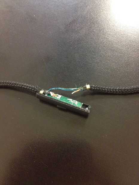 Inicialmente pensé que el problema fue por el gato, pero después de cortar las capas protectoras descubrí que estaba equivocado... El problema era realmente en el cable justo antes el botón mic/pause y no a los auriculares.