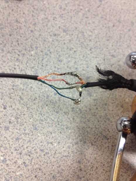 usé un cuchillo del Exacto para cortar la capa exterior y el alambre. ¡Ten cuidado! El cuchillo del Exacto es muy filoso y puede cortar usted y los alambres internos. Estos auriculares tenían 4 alambres internos probablemente porque tenía un botón en línea mic/pausa. Me separó hacia fuera y preparado para soldar. Tenga cuidado al soldar. ANTES de que la soldadura-si desea utilizar tubería para proteger tu trabajo de ponerlo ahora en encogimiento. Fue complicado soldar los cables porque se movían tanto. También la soldadura no quiere quedarse en el alambre. Tener paciencia! Después conecté los cables he probado los auriculares... que trabajaron!
