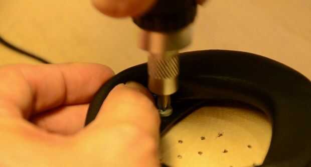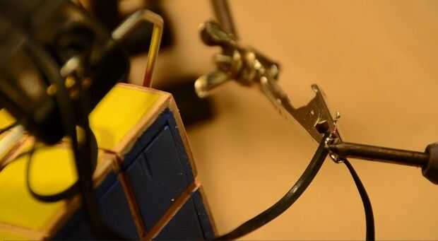 Quitar el relleno de la cinta para la cabeza y pasar el cable por el agujero cerca del extremo de la diadema, pero deje suficiente holgura para que el alambre no rip si la carcasa gira demasiado. Usar negro eléctrico cinta a cinta el alambre a lo largo de la parte superior de la diadema. Poner la venda acolchado espalda en y conecte la otra bisagra y vivienda. El otro cable de alimentación a través del agujero de la cinta dejando suficiente holgura. Conecte los extremos de dos hilos girando Junta, añadiendo soldadura y luego algunos pegamento caliente para la estabilidad. Envolver con un trozo de cinta aislante. Doble el cable sobrante nuevamente en la venda y utilice cinta otra vez para mantener en su lugar. Ajustar la venda acolchado para que cubre los cables.
