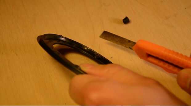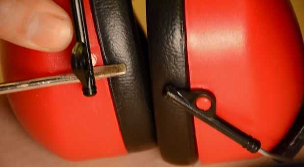 Quite las bisagras de manguitos del oído con un destornillador de cabeza plana por acuñar entre el oído y la bisagra y luego enroscarlo. Levantar el cojín a un lado y quite los tornillos. Hay dos tornillos por orejeras. Quite la almohadilla de la abrazadera de plástico. Con un cuchillo cortar la guía del tornillo del soporte del amortiguador.