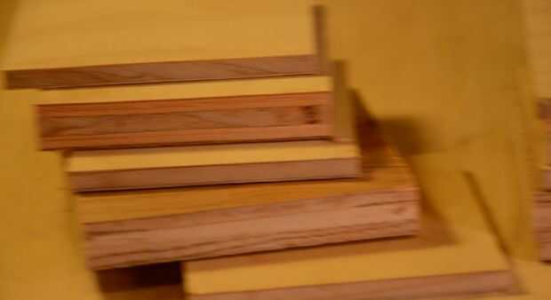 Cortar 6 cuadrados de 3 pulgadas (76 mm) de cada uno de los 3/16 y 15/32 piezas de madera contrachapada. La caja se montará en esta manera: fina-gruesa-fina-gruesa-fina.