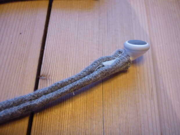 elementos necesarios: (1) cuerda, (1) juego de auriculares auricularesParte del bucle de paso 1) de la cuerda alrededor del dedo.Paso 2) Tye en un nudo, asegúrese de dejar suficiente espacio para permitir que se deslice a través de los auricularesPas