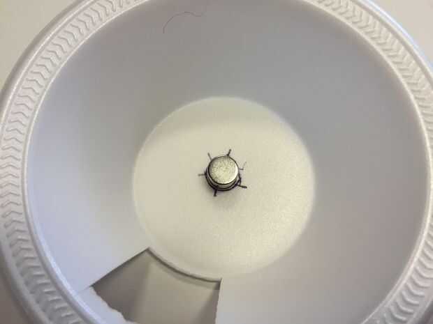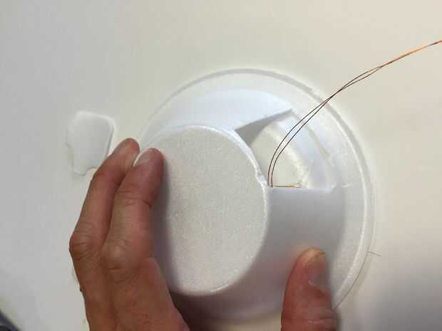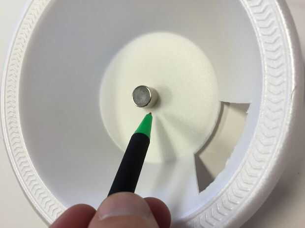 • A diferencia de cómo se ve en la imagen: no serpiente termina el alambre del imán a través del orificio en el recipiente. Más bien dejar que el alambre del imán van entre la placa y el tazón de fuente por ahora. A serpiente los cables a través del agujero en un paso posterior después de que el imán se pega.