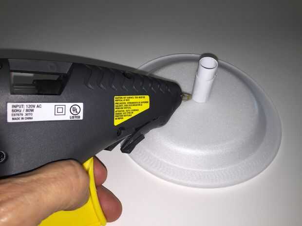 Usar una pistola de pegamento caliente, pegar el rollo de bobina de voz externo al centro de la placa, teniendo cuidado de no conseguir cualquier pegamento en el rodillo espaciador interno.