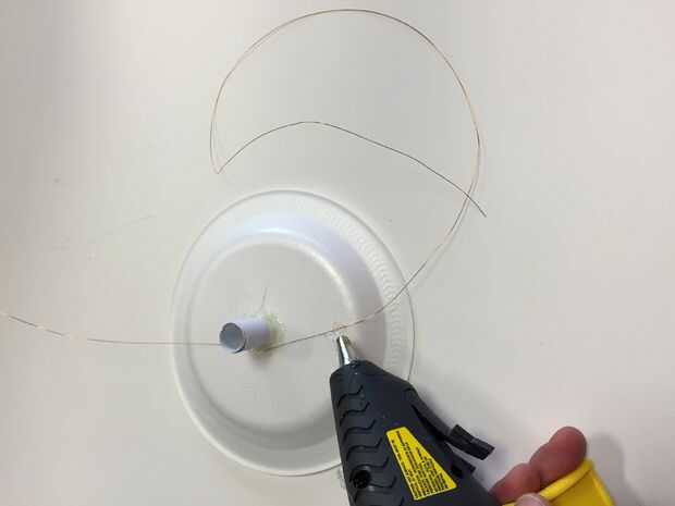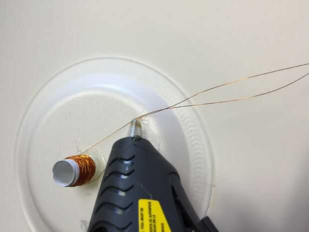 - Después de 150 + vueltas, pegamento caliente (o cinta) el cable a la placa cerca de donde se pega el extremo inicial del cable.