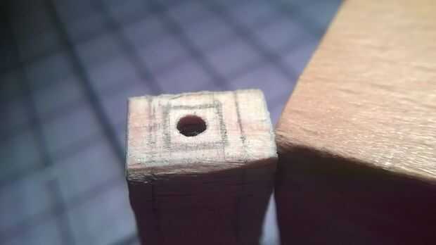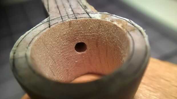 Perfore el orificio principal de la parte inferior con broca de 8mm. Medir, indicar el lugar del cable y taladro con broca de 2mm. Ten cuidado, debe ser perpendicular al lado. Empezar a lijar la capa exterior del cono y la parte interior.