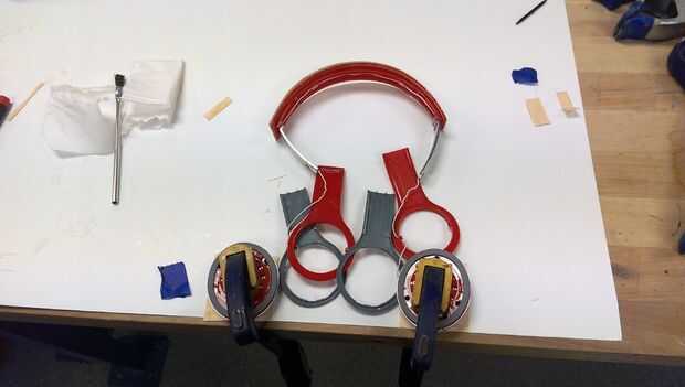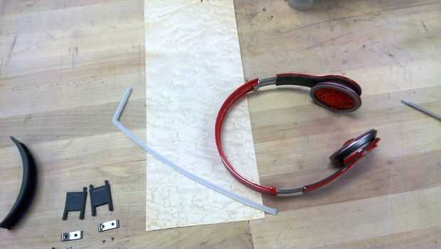 Primero cortar las piezas de chapa, mide las partes de los auriculares con un limpiador de pipa y transfiere las medidas a la hoja de chapa. También hice las piezas de chapa más grande que el plástico debajo para que puede ser recortado a tamaño más tarde.