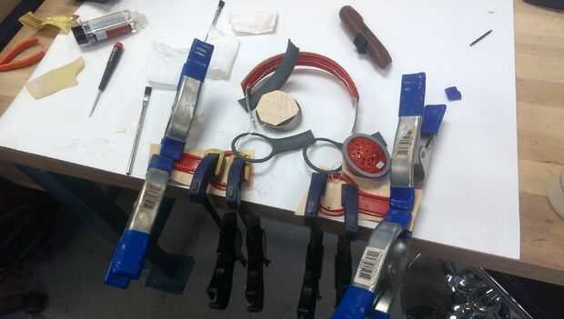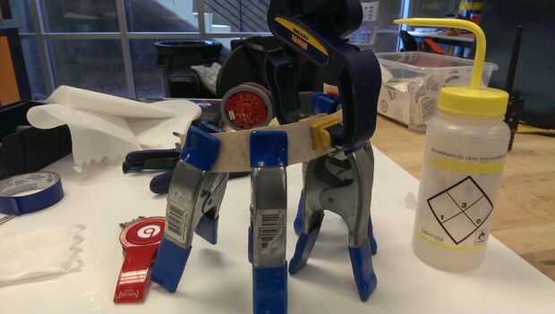 Así que ahora que está todo establecido para pegarla es tiempo para mezclar el epoxi. He usado resina de 5 minutos, aunque recomiendo 30 minutos pero no tengo ninguna (5 minutos era un poco de prisa). Luego aplique el epóxico mezclado a la superficie lijada del plástico y empezar a aplicar la carilla a la superficie. Lo hice a partir de un lado con una abrazadera, entonces agregando más abrazaderas hasta que cubría toda la superficie. Nunca he oído de alguien que usa demasiado muchas pinzas, tantas como puede caber tanto uso. Después lo es mirada sujeta sobre la superficie para asegurarse de que no hay lugar donde viene la chapa de plástico.