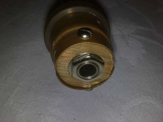 6. ahora debería tener un lindo poco cobre nódulo que es la vivienda el 1/4" jack, el único problema es que con el tiempo el ajuste cómodo disco de madera contrachapada se aflojará y cada vez intenta enchufar un cable de audio aparecerá en esta vivienda. Resolví este problema perforando un agujero pequeño en cada lado del disco (a la derecha a través de la toma de cobre) e insertando tornillos diminutos. Estos tornillos se mantenga el disco de madera contrachapada en su lugar y que sea fácil abrir si hay cualquier problema de cableado más tarde. Si no encuentra tornillos pequeños suficiente puede sólo pegamento o el disco en lugar de epoxy.