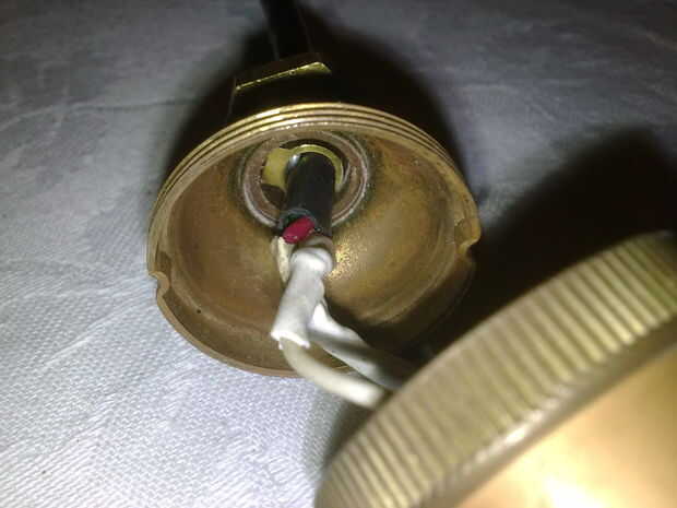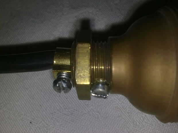 5. mi casquillo bombilla tenía un tubo en el extremo a través del cual perforé un agujero apenas más grande que uno de los tornillos del bloque de conector de latón. Entonces uno de los tornillos del bloque conector puesto a través de este agujero para mantenerlo en su lugar. Este tornillo, cuando apretó, también sujeta el cable hacia abajo evitando así que se sacó.