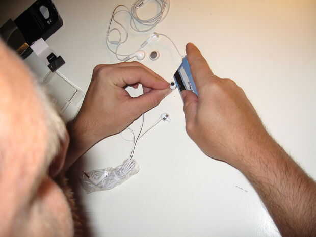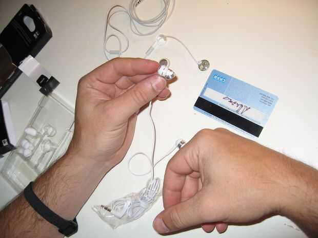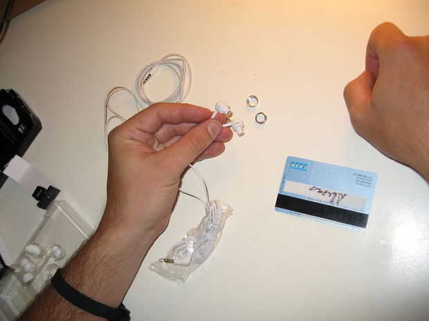 Use el cajero automático o tarjeta de crédito para empujar hacia fuera los anillos metálicos alrededor de los auriculares de Sennheiser. Ser firme y suave al hacer esto y no utilice un cuchillo o algo metálico, como accidentalmente puede dañar o rayar los auriculares nuevos.