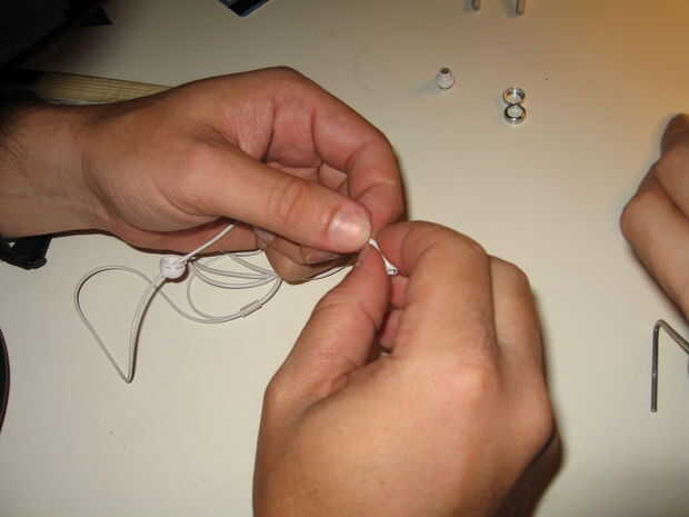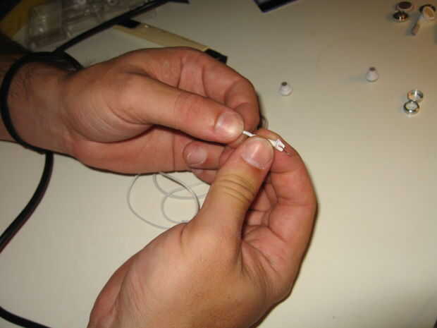 Utilizar algunos saliva como lubricante y también para limpiar algunos del pegamento en los cables, etc.. Al final fijar un nudo en el extremo de los cables de iPhone, preferiblemente en el mismo lugar el nudo original.