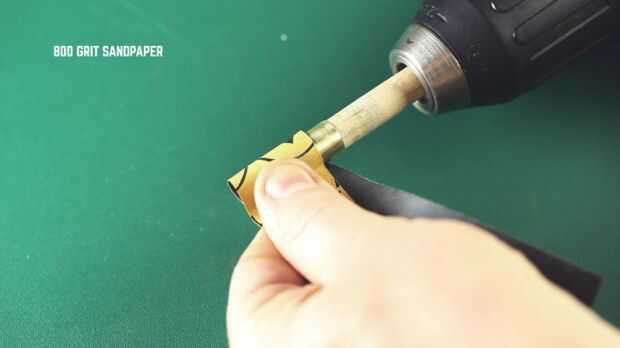 La espiga de madera de 10mm de la abrazadera en el taladro y puso su concha sobre él, debe ajustarse bien y apretado. Todo esto actúa como un torno simple, perfecto para un lijado rápido. Estaba usando grano de 400 y 800 lija para limpiar la cáscara.