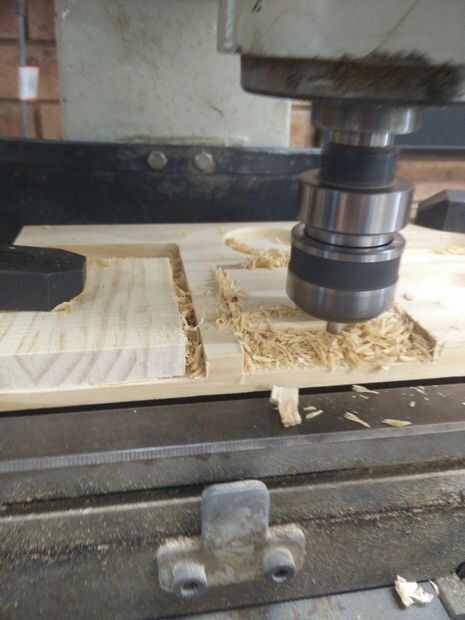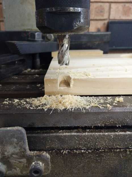 Coloque la base en un molino de madera, utilizar piezas de madera de desecho para la sujeción de modo que la base no se dañen por la presión de las pinzas, una vez que la base esté firmemente sujeta Alinee la broca y el taladro a la profundidad deseada que se necesita para la anchura de su teléfono o la cartera de la casa y corte un contorno de la forma , una vez que hay un esquema comienza moliendo la madera en una formación de zig zag al daño de riesgo y las imperfecciones de la madera.