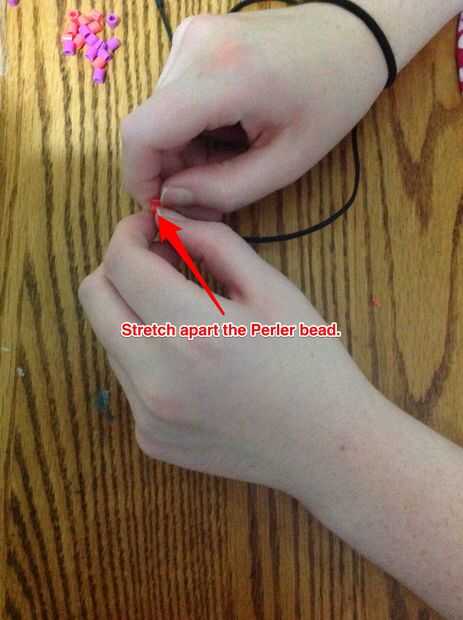 Después de cortar el grano Perler estirarlo abierto. Debe hacer esto con el fin de obtener el grano alrededor de cable de los audífonos.