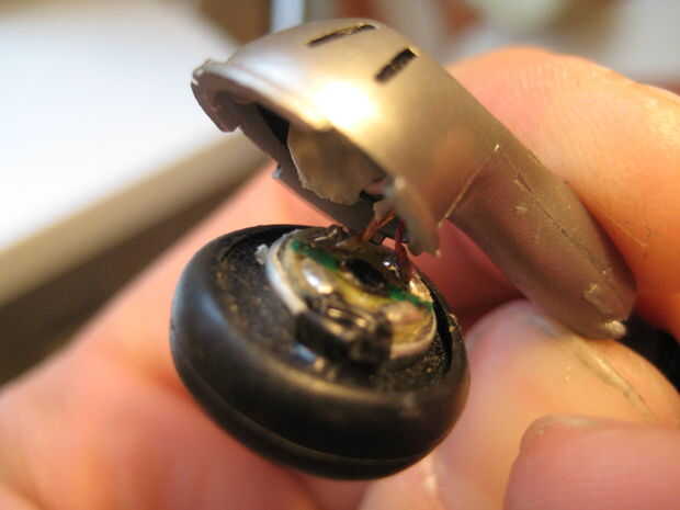3. Corte una de las fundas de los auriculares in-ear de y deje los cables expuestos.