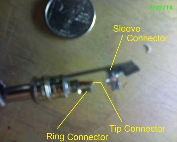 Nota: estos pasos altamente dependen donde tenes el tus piezas. Si tienes los de digikey o radio shack, no mucho trabajo es necesario, es bastante fácil de determinar que contacto corresponde a la punta, el anillo y la manga. Si los tienes gratis podría no ser tan obvio. En cualquier caso si no está seguro, utilice un ohmímetro para averiguar qué conector lleva a que en contacto con el enchufe.