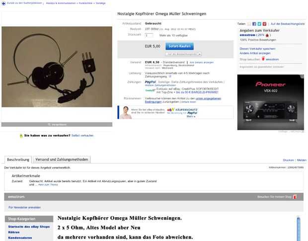 En la oferta se puede leer que su resistencia interna es de 5 ohmios. La resistencia interna de hoy en día usado moderno cabeza-un auriculares es de 36 ohmios (gracias Horatius vapor para obtener esta información;-)).