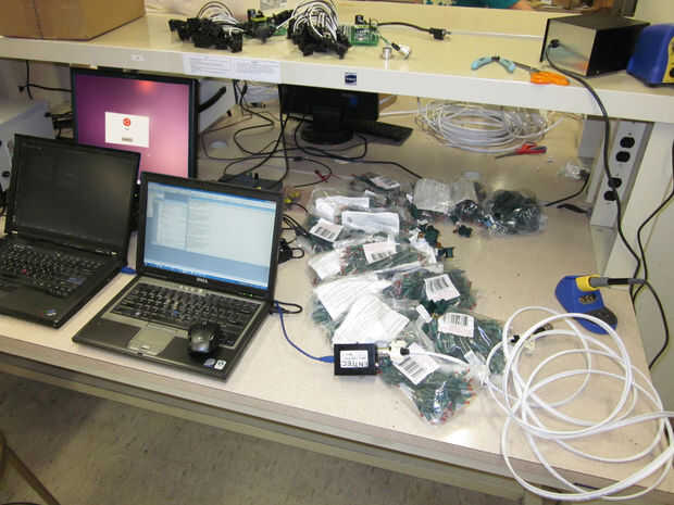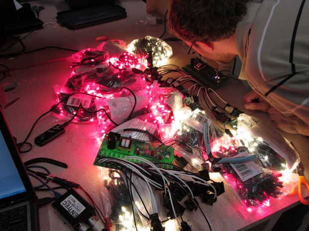 Todo lo creamos nosotros mismos, hasta los cables DMX. Utiliza un carrete de cable CAT5 clasificado al aire libre y soldamos con cuidado los necesarios conectores XLR de 5 pines en cada extremo. Mientras que los conectores eran caros, decidimos que valía la pena pudiendo reutilizar nuestra electrónica con cualquier instalación estándar de DMX.