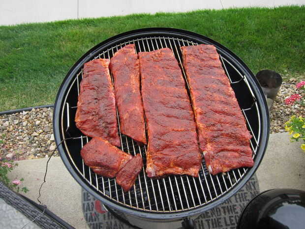 Una vez que el fumador se levanta a temp, añadir la carne.  Aquí tengo las parrillas de las costillas y las piezas que cortamos para puntas de costilla.  Si no lo has hecho ya, añadir la madera caliente carbones.