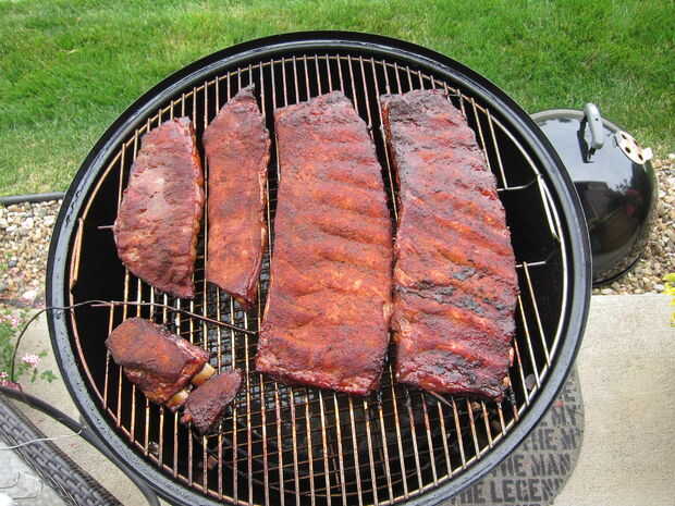 Después de las costillas alcanzan el color que desee, tire de ellos apagar el ahumador para que podemos envolverlos.  Están buscando un color rojo, casi caoba oscuro.  Generalmente llego a este punto después de 2-2.5 horas del tiempo de cocción.