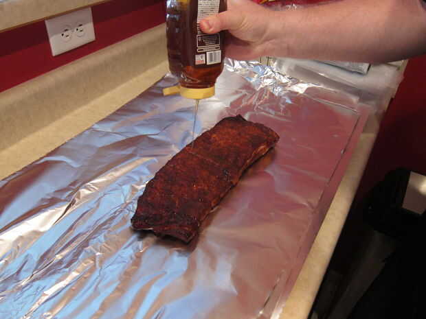 Poner las costillas en dos hojas de papel de aluminio.  Añadir un chorrito de miel a la parte superior de las costillas.