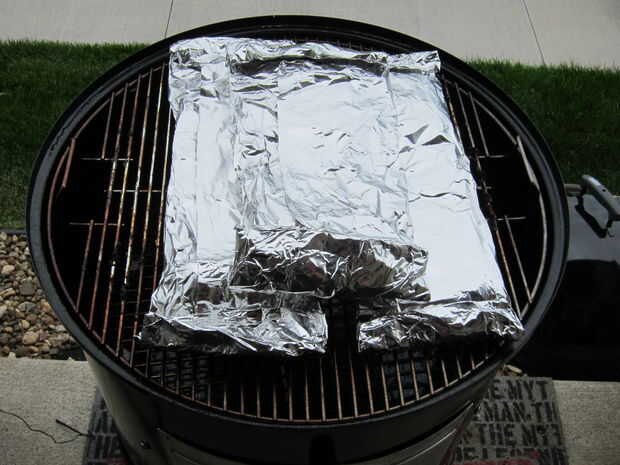 Después de envolver bien las costillas, volver al lado fumador de la carne hacia abajo.  Dejarlos durante 1,5 horas adicionales en 230F antes de volver a ver en ellos.