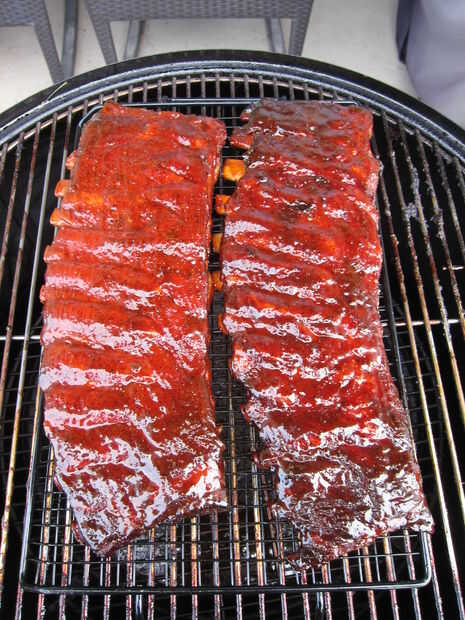 Volver a poner las costillas en su ahumador a 230F para acerca de 30 minutos para fijar su salsa.  Salsas tienen mucha azúcar así que asegúrese de vigilar para que las costillas no se quemen.