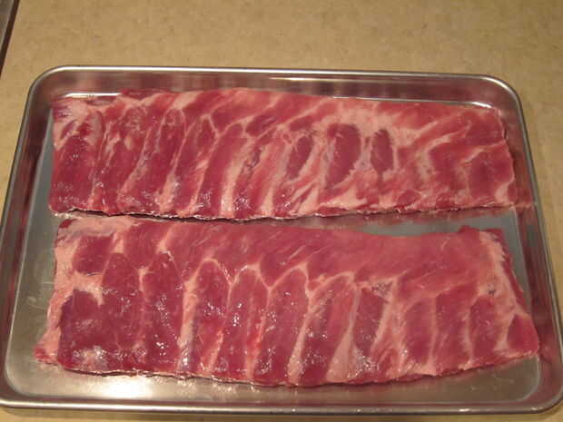 Las costillas cortadas deben parecerse a esto.  Observe las áreas grandes de grasa se han quitado y los bordes cuadrados para arriba.