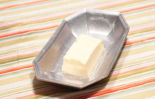 Cuchara de mantequilla en el molde, presionar sobre una superficie dura. Deseche cualquier suero de leche que se exprime hacia fuera. Si no tienes una cuchara sólo molde en un recipiente pequeño.