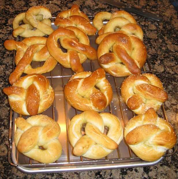 Hornear pretzels durante 10 minutos a 450F. Transferir inmediatamente a una rejilla para enfriar.