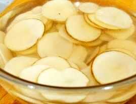 Cocinar las papas en chaquetas en agua con sal. Cuando apenas horquilla blanda, drenaje. Poner las patatas en rodajas en una ensaladera y reservar.