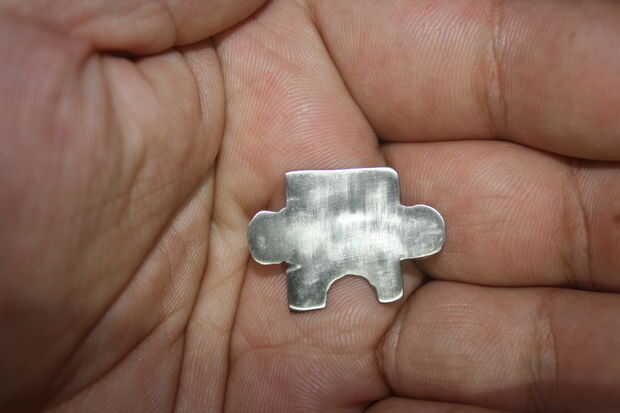 este es el colgante que hice para mi sobrino. Era simple pero rápido de hacer. Sólo haz un níquel y martíllelo hacia fuera y tome unas tijeras y cortar una forma de ruff de una pieza del rompecabezas y el archivo a la forma correcta.