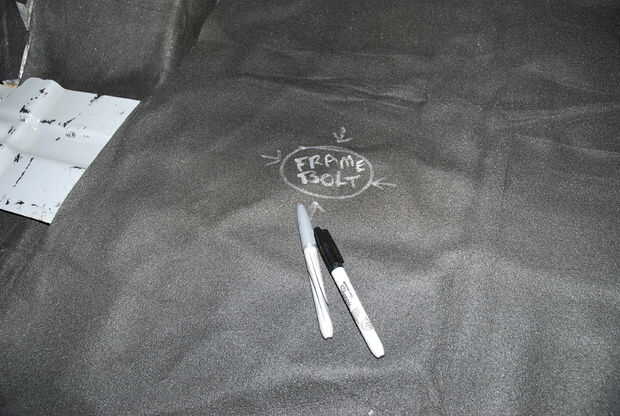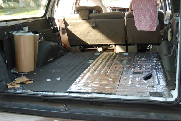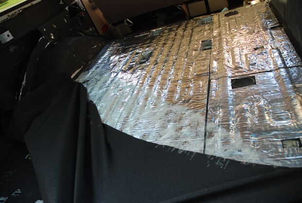 Con rápidas medidas ásperas y el adhesivo en aerosol, aplicar una capa de espuma de ensolite sobre la estera de aluminio/butílica fue relativamente rápido.
