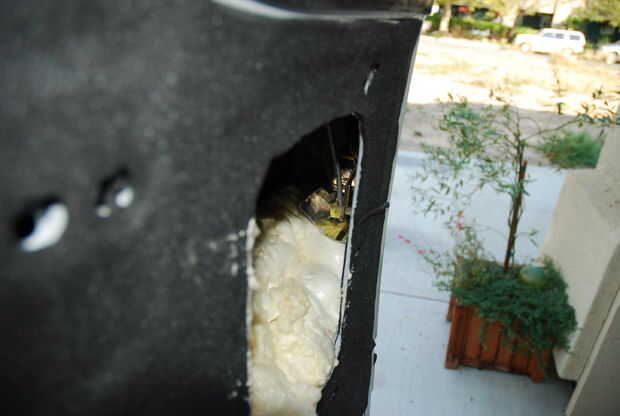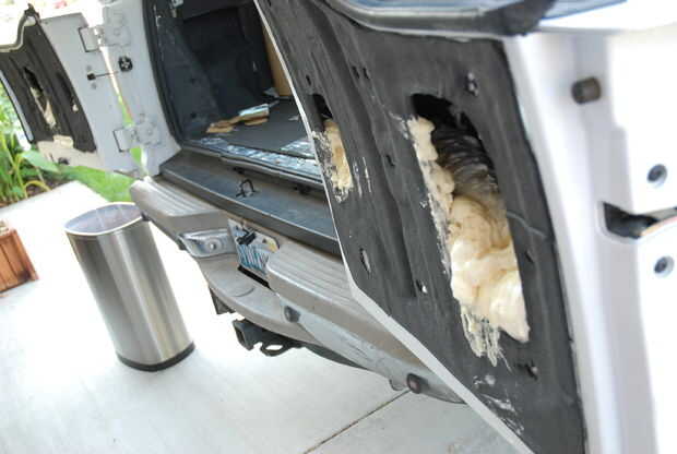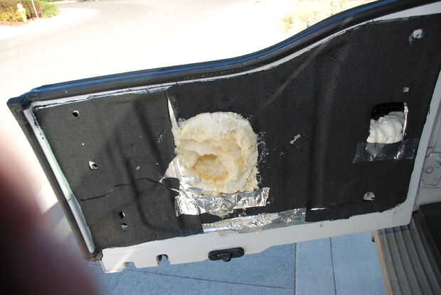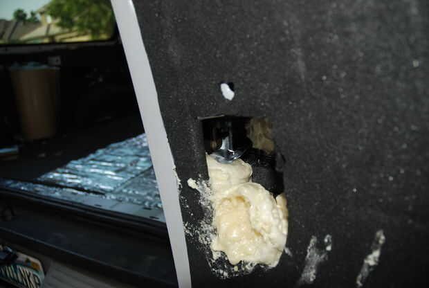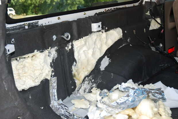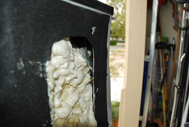 La espuma no seca constantemente. Áreas que no fueron expuestas al aire seguían siendo que filtra y líquido incluso varios días después. Inicialmente puse abajo una pareja capas de toallas de papel suelto para coger zonas que supe se desborda, dejando espuma grandes cascadas blop hacia fuera la parte superior de las presas de la cinta que hice para la brecha más grande se llena la forma.