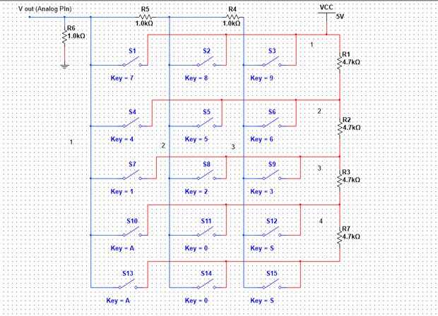 Este resistor de establecer es por lo que cada vez que se pulsa una tecla diferente, la corriente fluirá a través de diferentes número de resistores en serie. Dar a cada botón una tensión "dirección" que un análogo único pin puede leer.