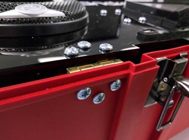 • Bisagras - alinear e instalar las bisagras con punto medio divisor de pivote al borde de la caja de herramientas de apertura