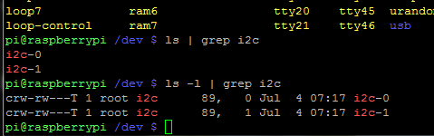 Compruebe los permisos en los puertos I2C. Los puertos deben configurarse como se muestra en la foto de arriba. Para comprobar los permisos cd/dev. Escriba ls -l | grep I2C. Los permisos deben establecerse como se muestra en la foto. Cambiar los permisos con chmod, si no son correctos. Hay mucha literatura en la red para chmod si no ha utilizado este comando antes. Mantenemos las restricciones tan firmemente como sea posible como la parte o sistema posiblemente puede ser daño por I2C incorrecta.
