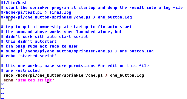 La secuencia de comandos de bash es el secreto para hacer que todos los permisos de trabajo para la secuencia de comandos para el acceso a los puertos después de los otros cambios. Asegúrese de configurar los permisos para la shell bash no debe ser editable por todos y probablemente no por grupo. Para que este ejemplo funcione el .bsh archivo necesario para ubicarse en /home/pi. El uso de sudo da permisos para el script de Perl para puertos de acceso del I2C., sin que por ello habrá problemas con el script de Perl acceder a los puertos incluso con el conjunto de permisos.