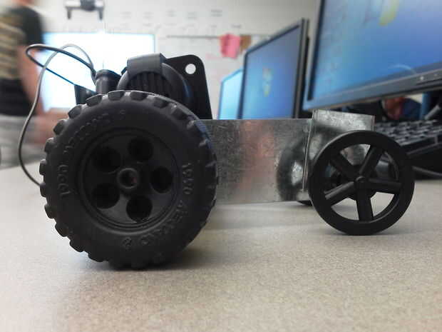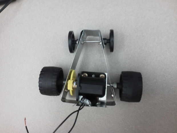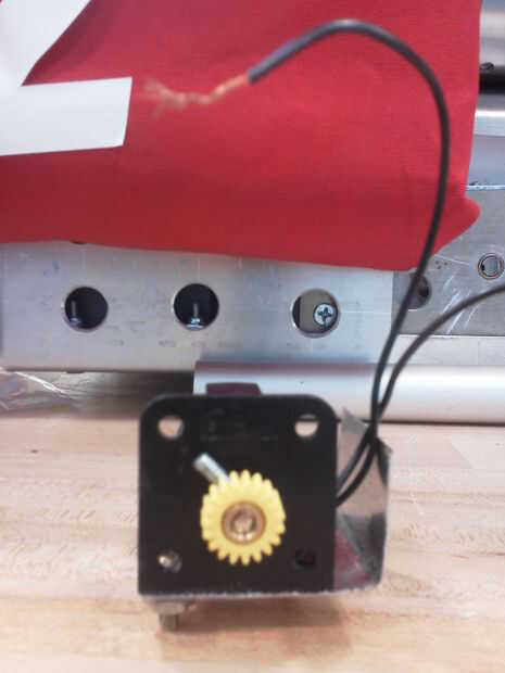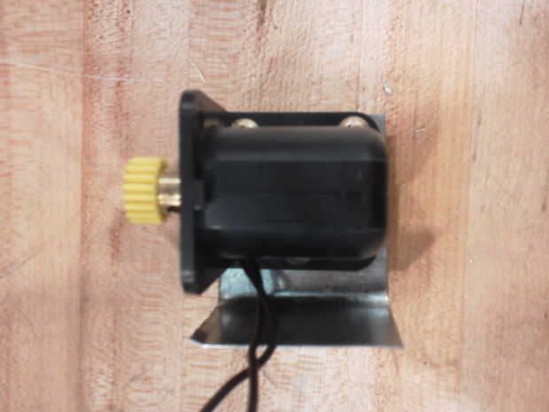 18. en el extremo más largo de la montura que hiciste en los pasos 16 y 17, perforar un par correspondiente con los agujeros de sus motor. Coloque pequeñas de engranajes rectos en su motor y asegúrelo. (Asegúrese de que dejar suficiente espacio para un destornillador entre la parte trasera de su motor y su montaje).