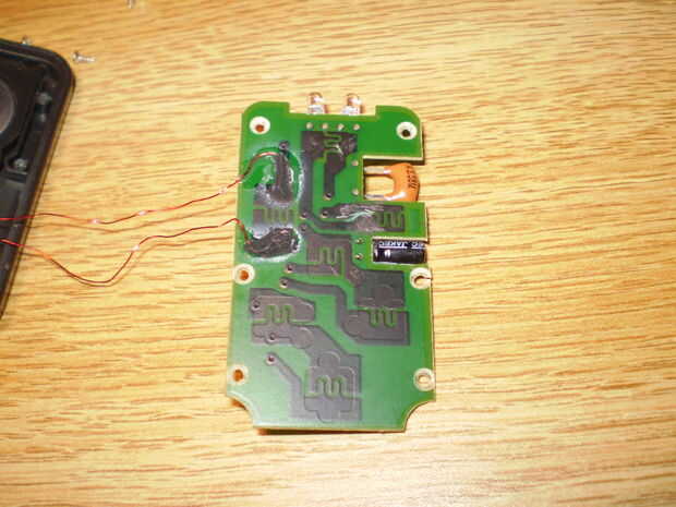 Connect 2 manómetro de alta cables del botón"power" o cualquier otro botón además el botón mute (lo que fije que determina lo que hará el control remoto automáticamente). Porque el botón de silencio se utiliza para buscar el necesario código de TV, es mejor izquierda sin tocar. Un cable para cada lado. Descubrí que el Thinkgeek pegamento de alambre conductor funciona mejor. (Soldadura no parece pegar al material conductor negro) Cuando el pegamento esté seco, aplicar un pegamento sobre el pegamento conductor para agregar fuerza.
