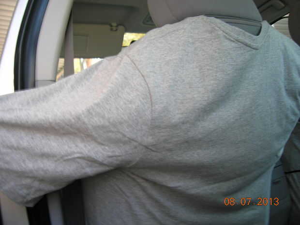 Montar las camisas XTL de 2 tamaño en los respaldos y liso. Meter los brazos en ellos mismos o coser a través de la abertura donde el manga se encuentra con el cuerpo de la camisa. Me daba pereza - yo solo escondido. También, así cuando me canso de este color, mi esposo puede todavía usar estos después que lavar!