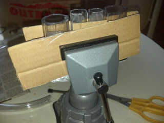 Yo no tenía la capacidad de hacer agujeros en un bloque de madera o de ladrillo para sujetar los tubos de yeso por lo que opté por mi tornillo de banco mesa. Usé cartulina para distribuir la fuerza. Usted puede notar que se curvan en algunas de las fotos. Lamentablemente la mayoría tubo claro viene en un carrete y aun dejando los libros de texto pesados en los tubos no ayuda mucho. Rellenado el centro un poco más con la cartulina para sostener los tubos más delgados en su lugar.