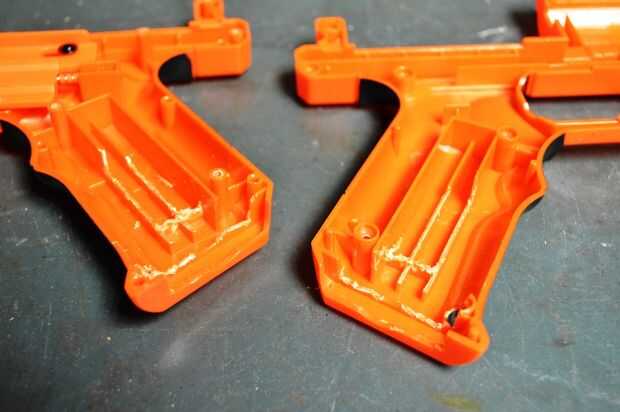1. Retire el refuerzo en el interior del mango. Me las arreglé sacar más con un cuchillo de stanly y alisar los bordes con una dremel.