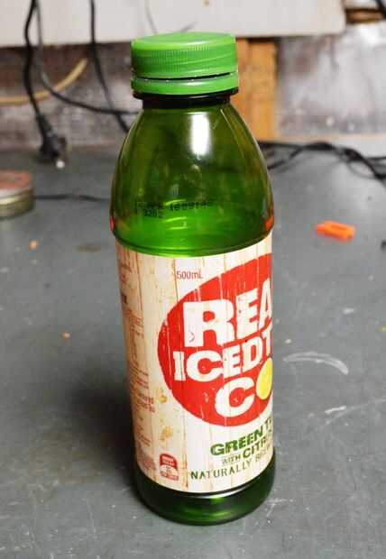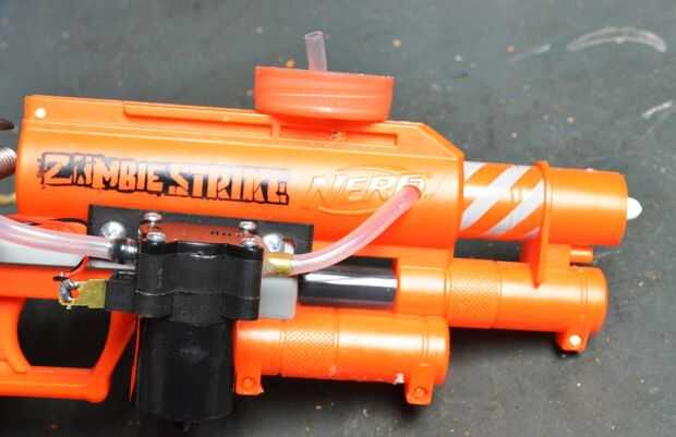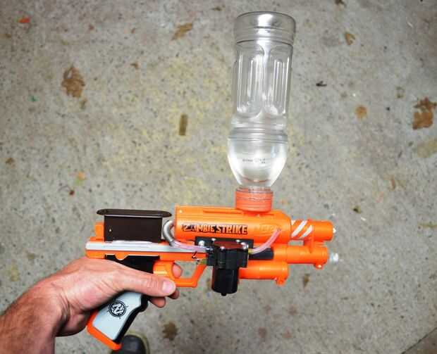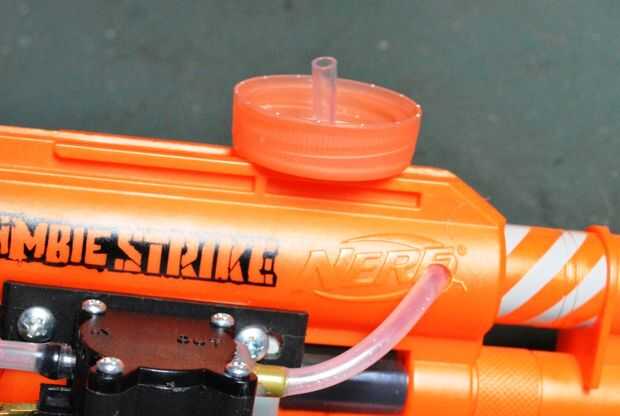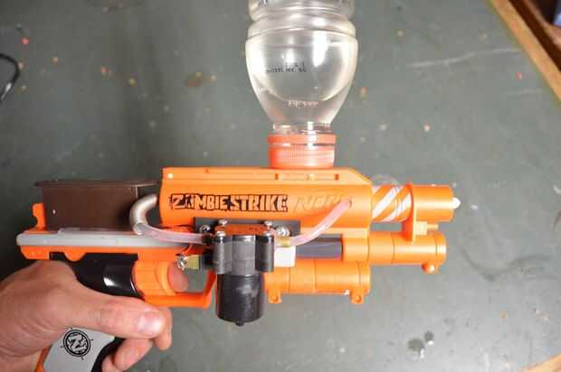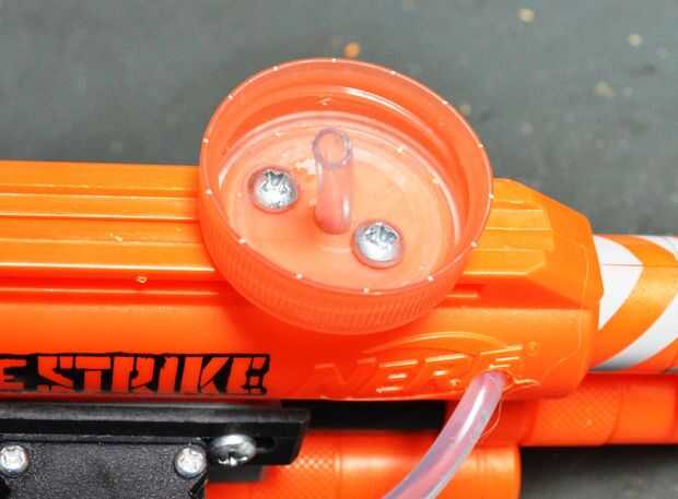 La hora en un recipiente de agua, mejor si tienes uno con una tapa grande. Esto hará fácil conectar a la pistola y también hará que la botella más segura. Recuerda la botella tendrá que ser para arriba-lado-abajo de la pistola y por encima de la bomba.