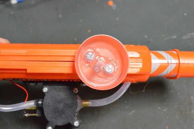 3. a continuación agregar poco de pegamento caliente alrededor del tubo y tornillos para hacerla impermeable.