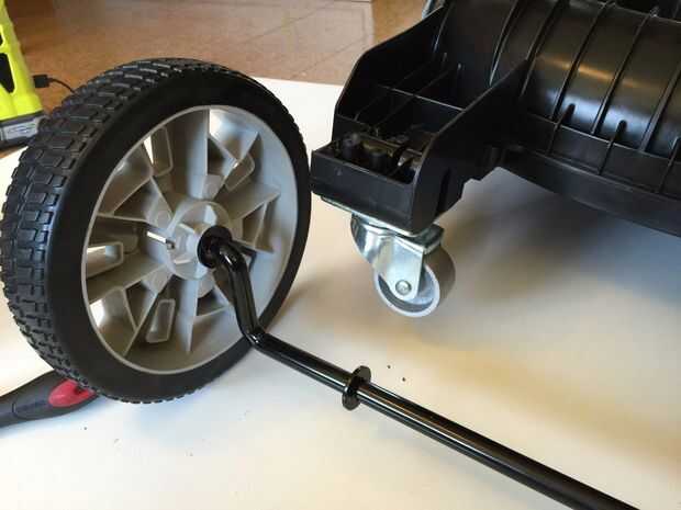 Normalmente cuando corte el césped de tu jardín, para dar vuelta a la usted empuje el mango hacia abajo para el extremo delantero se levanta y gira la cortadora de pasto. No funcionan aquí como hay costumbre ser un manejador del producto terminado. Así que tenemos que quitar las ruedas delanteras y el eje que conecta también el chasis.
