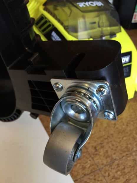 Una vez que se retiran, tomar las ruedas metal y fijarlos en el plástico que sobresale en la parte delantera de la segadora de césped. Estas ruedas giratoria de 360 grados que las hace perfectas para permitir mejor circulación de la máquina. Perfore 4 orificios que se alineen con los agujeros en las ruedas. Luego tome 4 pernos de 1", una arandela de bloqueo y una tuerca de cada una para asegurar las ruedas la cortadora. Esto es una cosa que nos cambiará a la siguiente iteración ya que esto levanta el cortacésped a considerable distancia de la tierra.