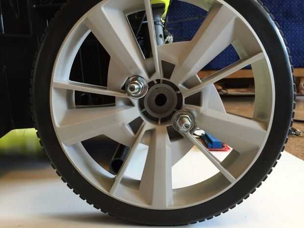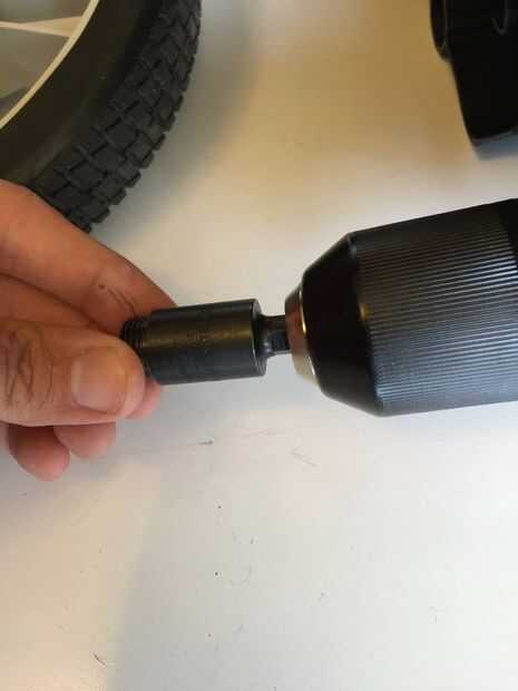 Una vez que han sacado las ruedas traseras, tenemos que sujete a los taladros. Esto es donde el conjunto vio bits entran en juego. Así que tome 3" agujero brocas Sierra y alinee con el centro de la rueda. Hay estos impresionantes agujeros convenientemente en la parte posterior hasta la línea. Tomar de 1/4" bits y perfore las ruedas. Luego tomar unas 3" tornillos de 1/4 y pasar a través de la broca y entonces aunque la rueda. Tomar una arandela, una arandela de bloqueo y una tuerca para fijarlo y apriete hacia abajo. Ahora puede el poco y poner en el taladro y apriete hacia abajo al igual que cualquier otro poco.